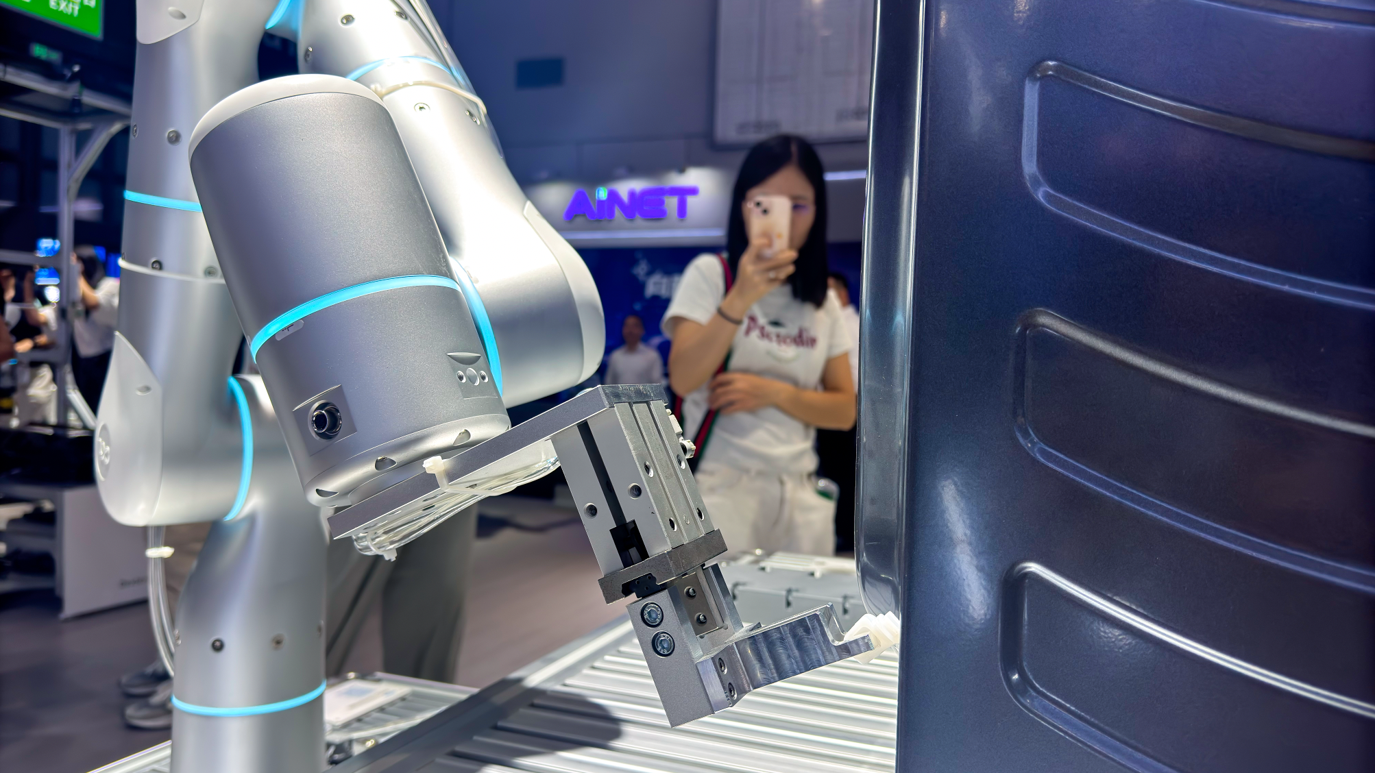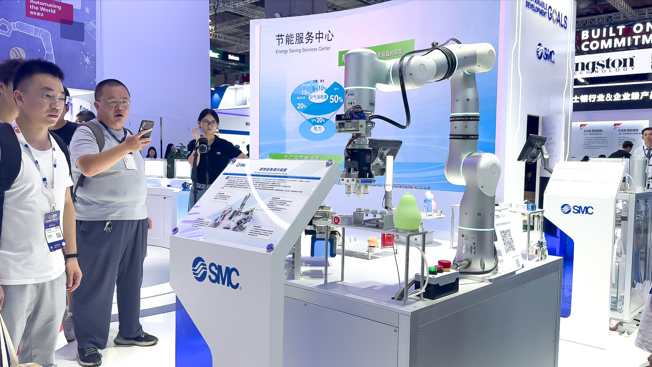 在本届工博会上,双方就联合展示了多项成果:非夕科技自适应机器人搭载SMC气动抓手及元器件,打造出双臂服务器装配测试综合展示和洗衣机总装线挂柱装配等典型场景。SMC依托无线快换与气动设备,与非夕机器人共同实现柔性拾取与称重应用。这些方案不仅展现了跨界融合的创新力,也为电子电气、汽车等行业提供了更具柔性和高效的智能制造解决方案。