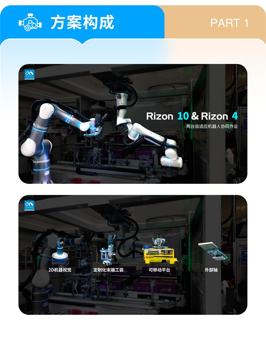 该方案采用Rizon 4和Rizon 10及其他设备协同作业,能够确保多机器人在固定空间内的灵活性和安全性,作业节拍60s。
