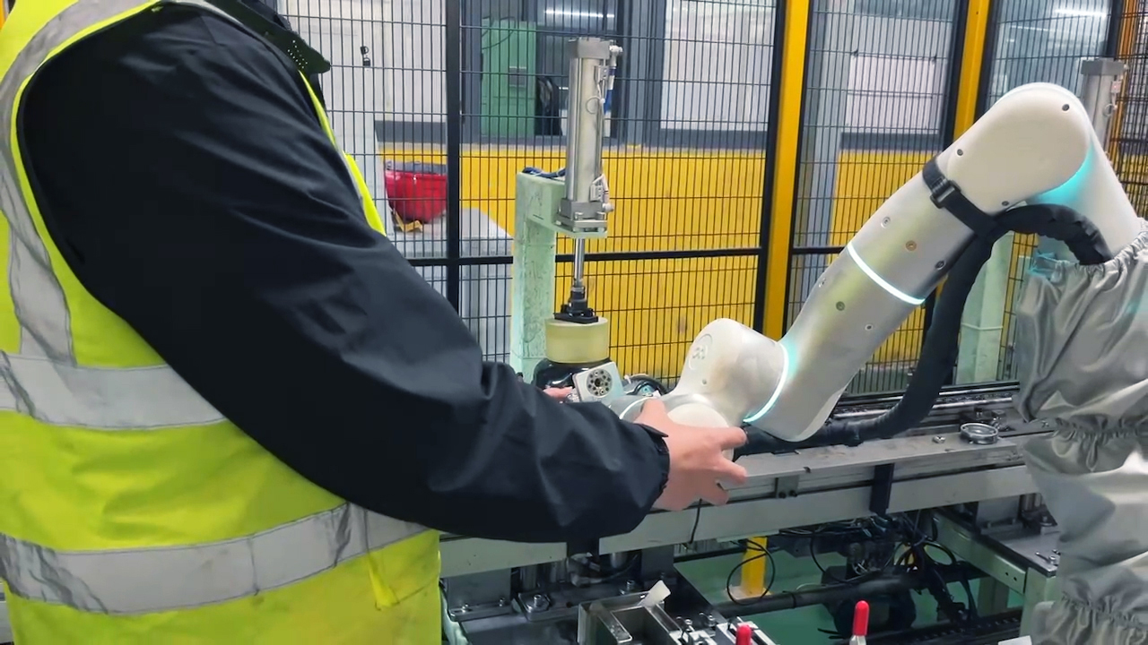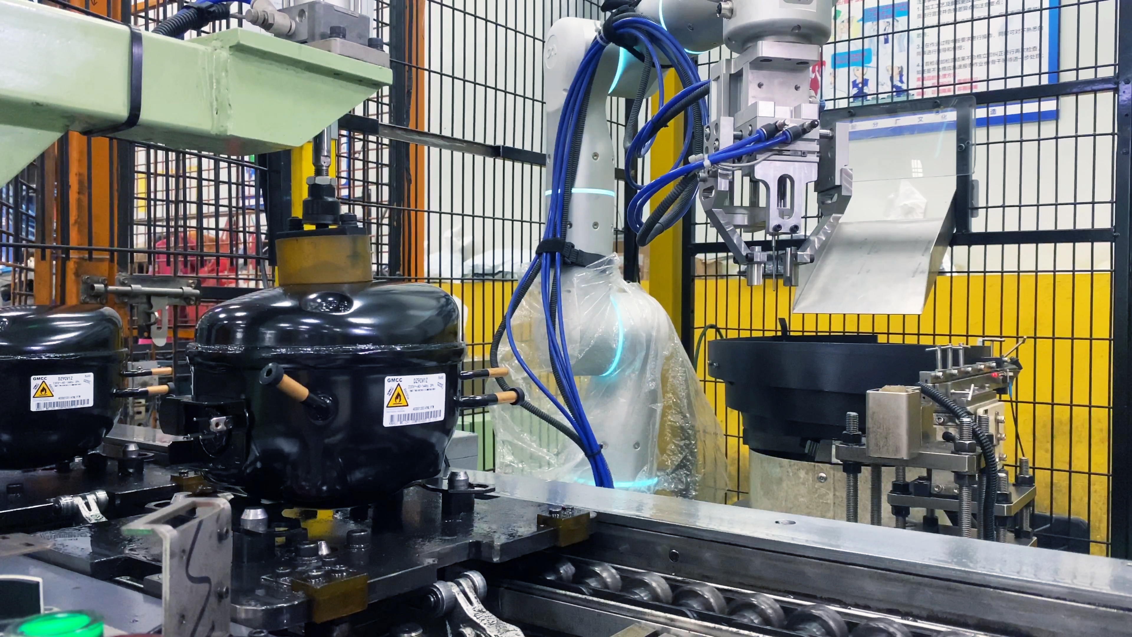 客户生产线上有数十种压缩机型号,及5种胶塞型号。为压缩机排气管装填胶塞时,需要用顶针将胶塞拉伸形变才能顺利装填。自适应机器人具备强大的力感知和力位混合控制能力,可以模拟人工手法进行力控装填。基于自适应机器人简单、柔顺的拖拽示教,经过简短培训的员工仅需2-3分钟即可完成快速换型。