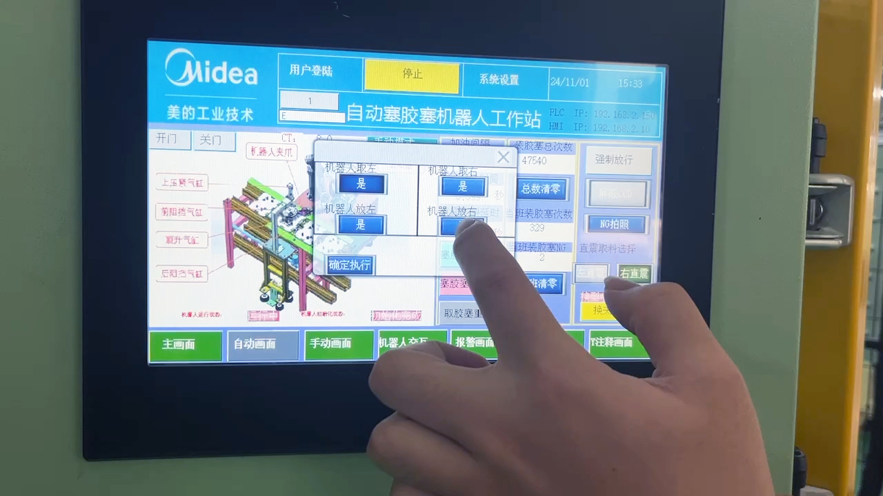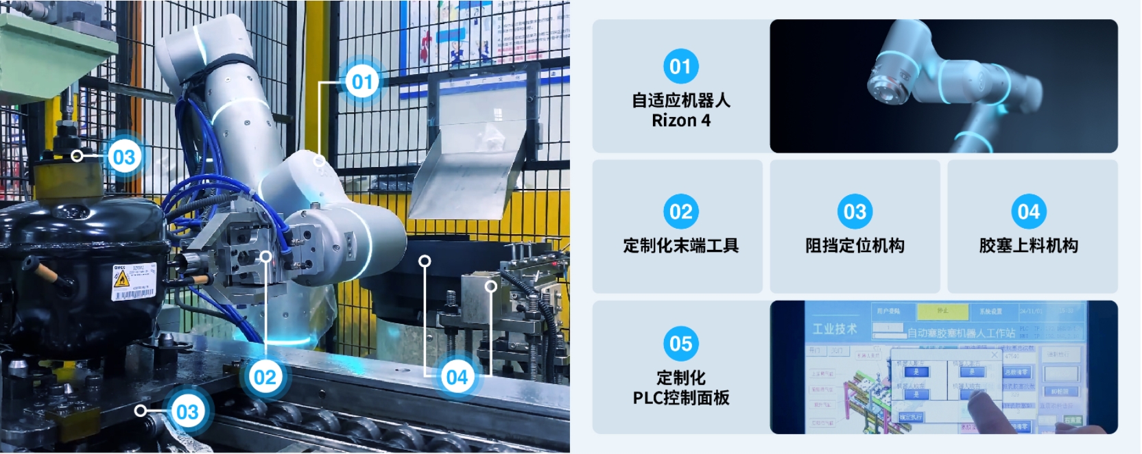 方案兼顾数十种产品型号及5种胶塞,通过结合机器人拖拽示教、末端工具快换,及定制化PLC触摸屏设置(15-100N装填力度),快速换型仅需2-3分钟。