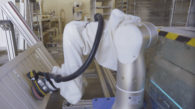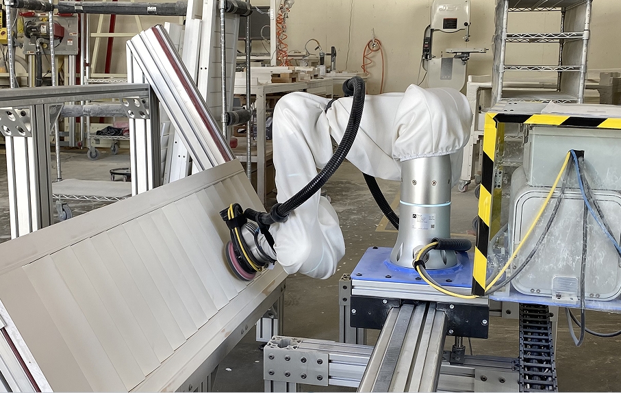 EsVata 是一家位于美国加利福尼亚的百叶窗生产加工工厂。木质百叶窗的打磨工序以往由熟练工人手工完成,但由于不同工人使用的打磨砂纸粗细度不一,工艺水平不同,产品的质量一致性难以保证。因此,EsVata希望找到高精度,高柔性的自动化方案优化这一劳动密集型环节,提高产品质量及一致性。