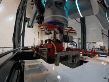 在打磨工序中,机器人使用末端工具A拾取并固定研磨材料,检测到位后启动力控研磨,均匀打磨腔体边缘。完成后,机器人会自动丢弃研磨材料并更换工具。