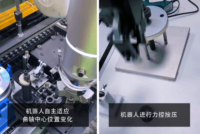 背景:客户空调压缩机产线上的曲轴与轴套安装配合间隙为0.022mm,而来料曲轴通常具有生产公差,同时以输送线工装板为主体的来料方式会造成水平位置偏差和角度偏差,这些误差的累积使得传统机器人难以完成如此精密的装配作业。