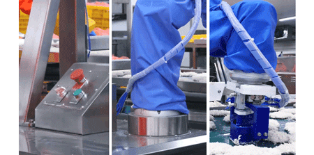 该工站具有极强的通用性,更换夹具即可处理多尺寸来料。仅需简单调试,即可复用于多种食品加工随线生产,换型、换线效率高。