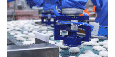 使用AI视觉准确识别产线上裹好粉的来料,自主判定并选择最便于机器人处理的鱼排。