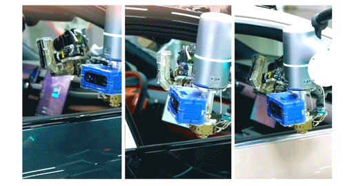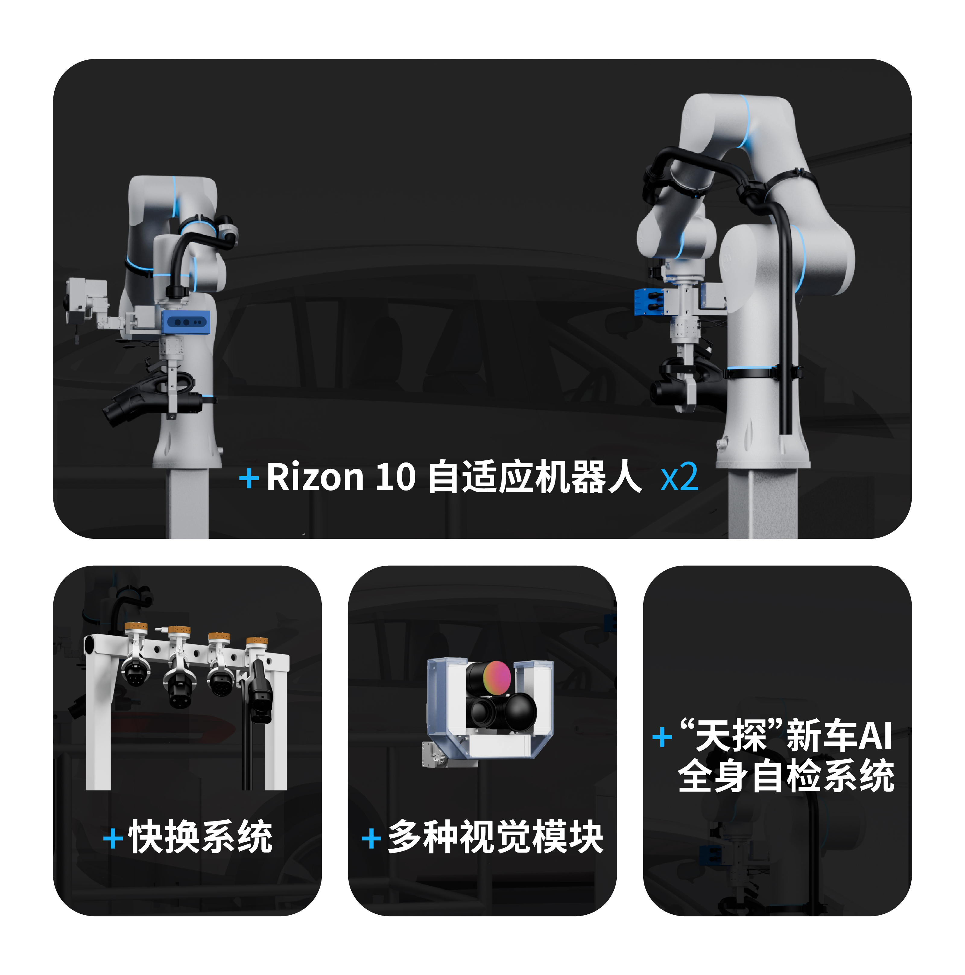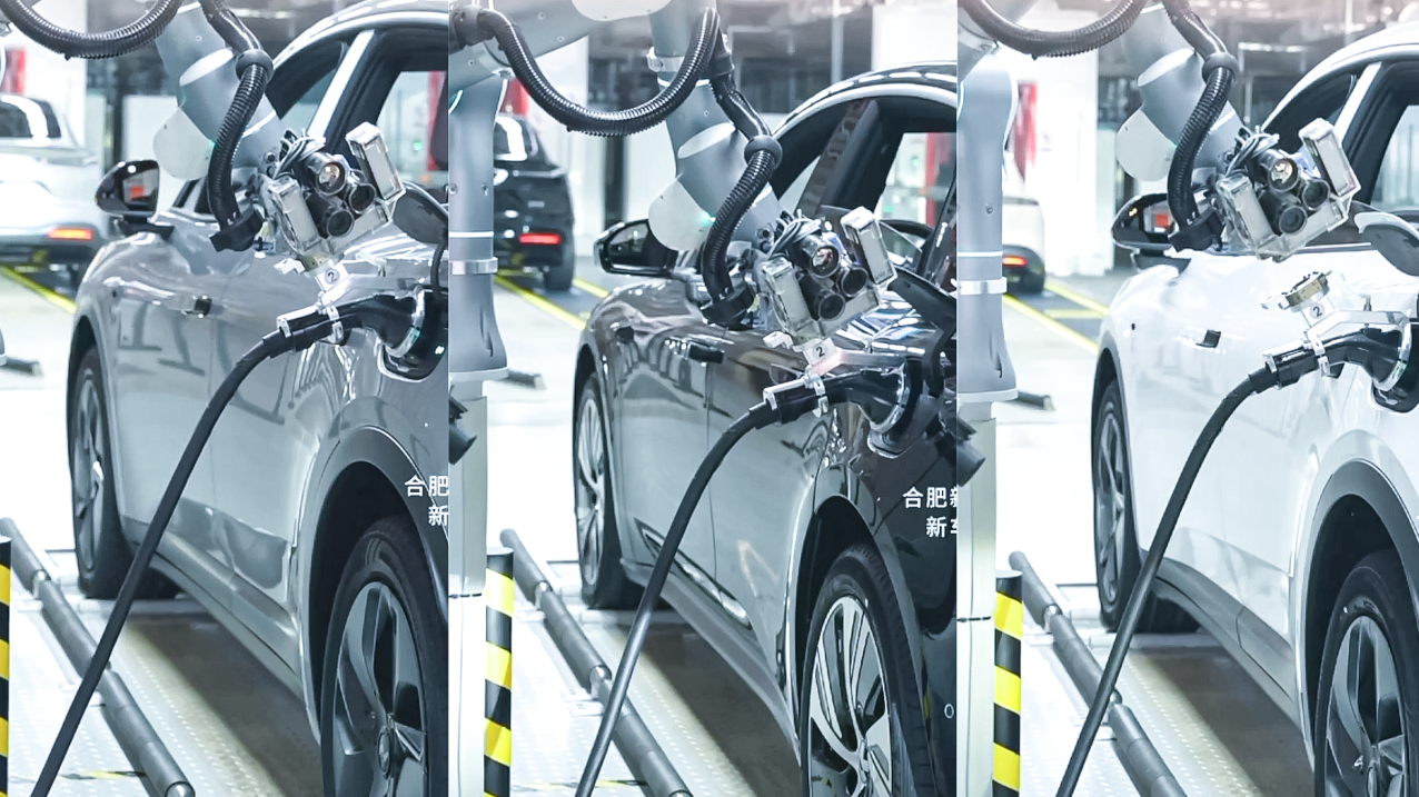 两台机器人可同时进行混线多任务操作,通过结合力控技术和快换机构,能够兼容六种蔚来车型、四种充电枪/口。