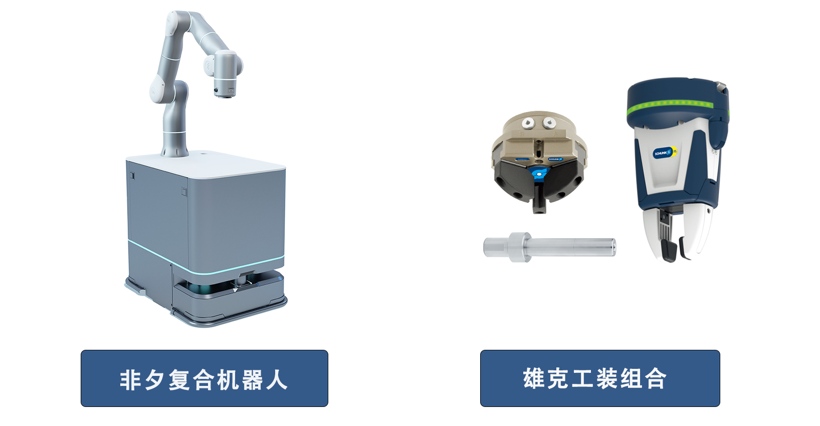 方案主要包括:非夕复合机器人(Rizon拂晓搭配AGV/AMR平台)和雄克工装组合(夹具、零点快换、机械手、机器人附件等)。