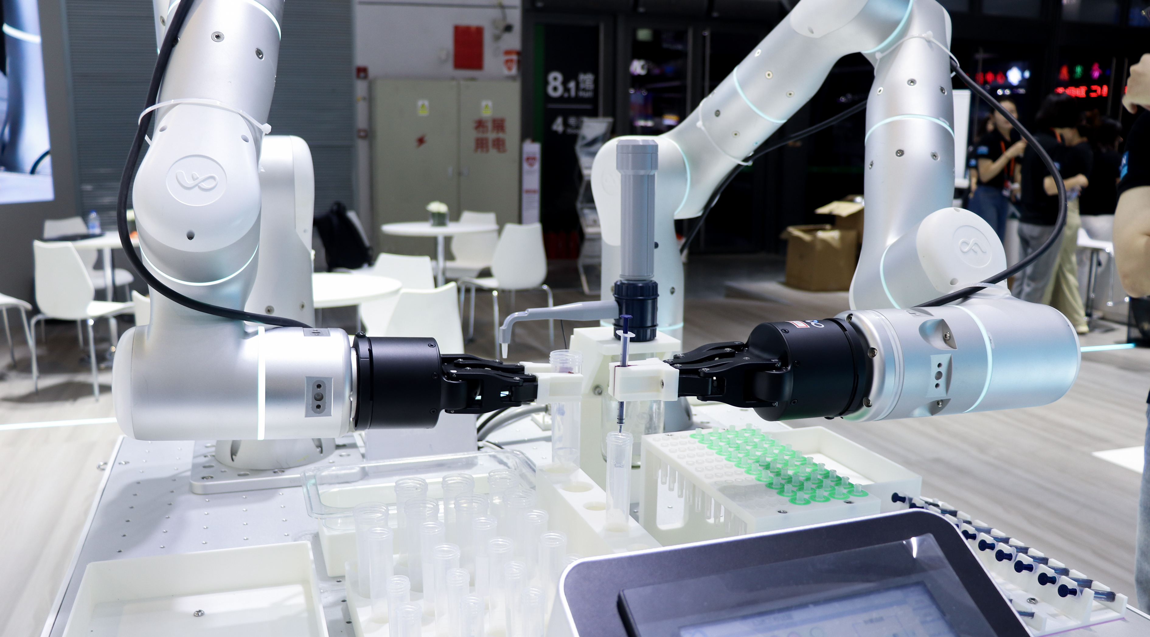 基于自适应机器人和非夕自研自产的力控夹爪Grav,非夕还带来了实验室自动化演示。这套演示能够能够灵活柔性地完成医药、生物、食品、日化等行业的实验室自动化操作,包括但不限于样本处理、仪器操作、配液、检测等标准化流程。